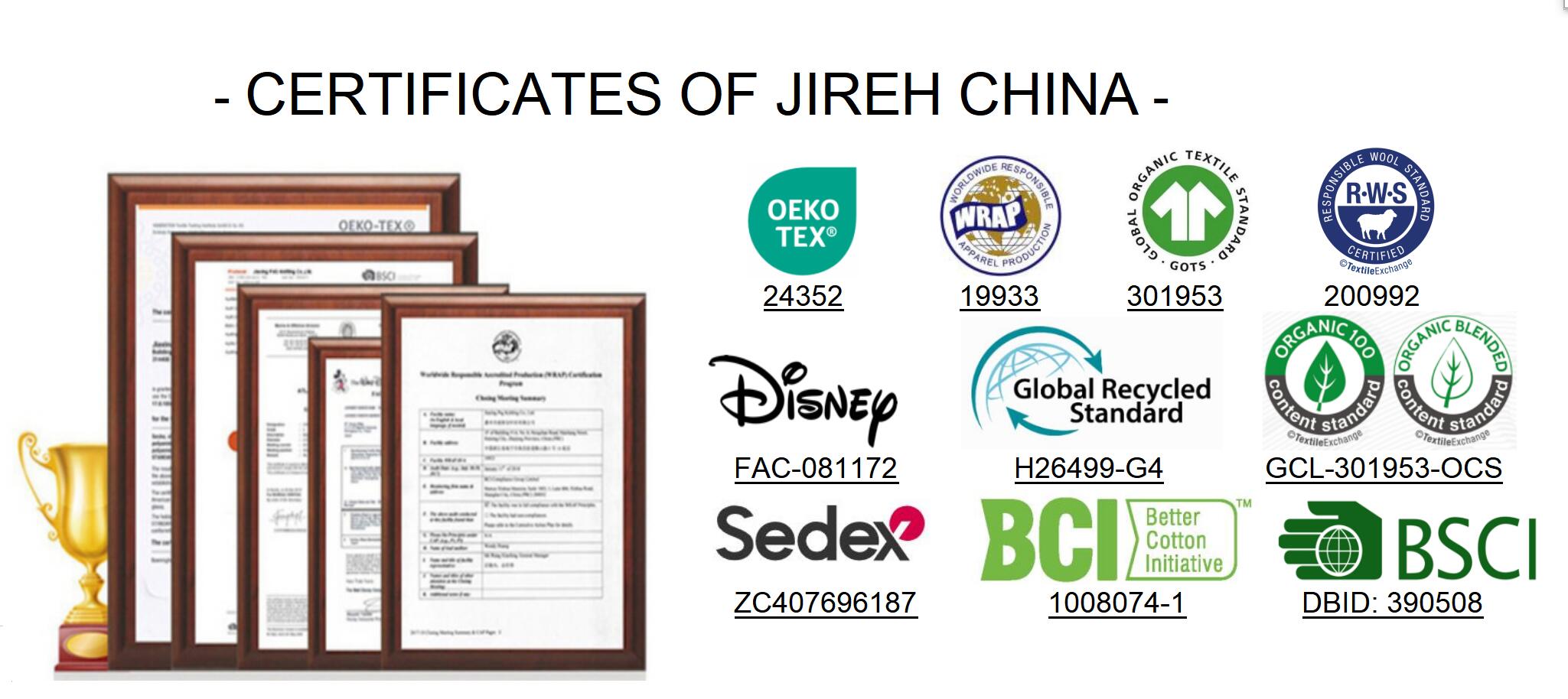 ➯ GLOBAL RECYCLED STANDARD 4.0 (GRS 4.0) - H26499-G4 ➯ THE MANUFACTURE AUTHORIZATION of DISNEY-BRANDED SOCKS - FAC-081172 ➯ MEMBER of BUSINESS SOCIAL COMPLIANCE INITIATIVE (BSCI) - 390508 ➯ WORLDWIDE RESPONSIBLE ACCREDITED PRODUCTION (WRAP) - 19933 ➯ OKEO-TEX STANDARD 100 CERTIFICATE - 13.HCN.24352 ➯ MEMBER of BETTER COTTON INITIATIVE(BCI) - 1008074-1 ➯ TRACEABLE WOOL SOCKS with RWS CERTIFICATE - CN-RAF-200992 ➯ GLOBAL ORGANIC TEXTILE STANDARD (GOTS)Version 7.0 - 301953 ➯ SEDEX SUPPLIER PLUS MEMBER - ZC407696187
